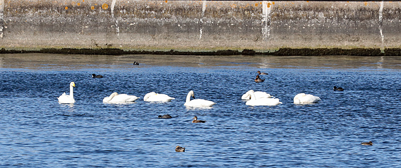 Most mornings we would start the day at Flamborough Obs with the ringing and gauge what to do next on the amount of overnight migration there had been. Due to the wind direction most mornings were a little slow so we would head off somewhere else one such place was Hornsea Mere. The Mere can be very good and has aways turned up something on our previous visits. This year we arrived and things looked pretty quiet but we met a local birder intently scanning through distant wildfowl and he told us he had seen a Black-necked Grebe and a drake Greater Scaup in with the many Wigeon. So we joined him and after a while I managed to find the Scaup an immature male or perhaps one still in partial eclipse plumage and a short while later found the grebe. Whilst we were there the wildfowl numbers continued to increase as birds were flighting into the Mere and whilst directing another couple of birders towards where the Scaup was in the growing raft of duck four Whooper Swan flew in and settled giving there typical 'hooping' calls.