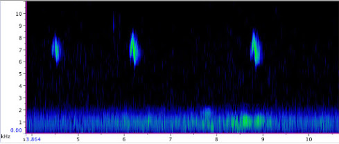 A nighttime recording of a Hawfinch passing over the listening station was a very nice recording to get two years ago. This recording was made in the autumn which perhaps wasn't to unusual as they have been seen at time on early visual migration watches around the harbour mouth and from Ballard. The sonogram/spectrogram only shows the second, third and fourth calls.